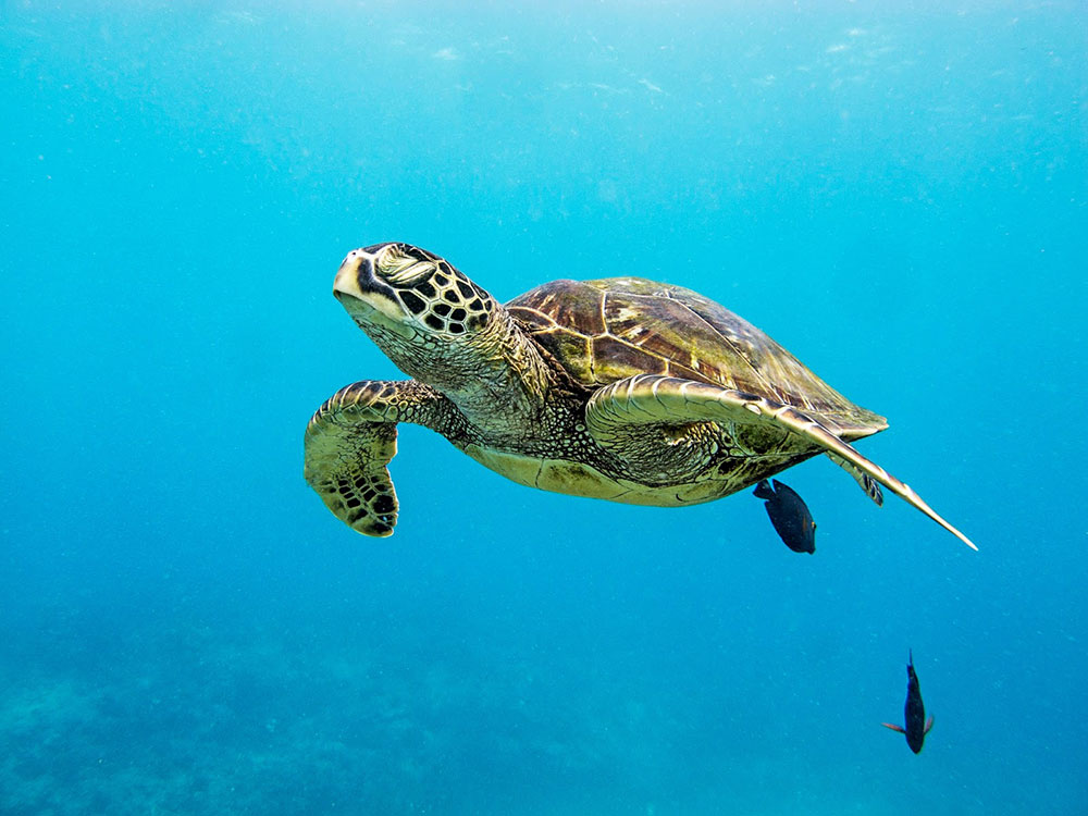 Hawaii’s blue waters are home to many beautiful fish and wildlife — including five species of sea turtles. While exploring the ocean you might spot the Green Sea turtle, Hawksbill, Leatherback, Loggerhead, or Olive Ridley. Olive ridleys, Loggerheads and Leatherbacks prefer deep offshore waters. The Green turtle is more easily spotted near shore and can sometimes be spotted on our tours. The Hawksbill turtle likes to nest on the main island but is much rarer.